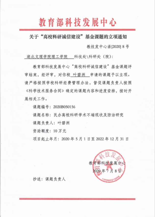 近日,教育部科技发展中心发布关于“高校科研诚信建设”基金课题的立项通知,我们科技处副处长叶碧洲同志申报的《民办高校科研学术不端现状及防治研究》成功立项,并获得10万元经费资助。