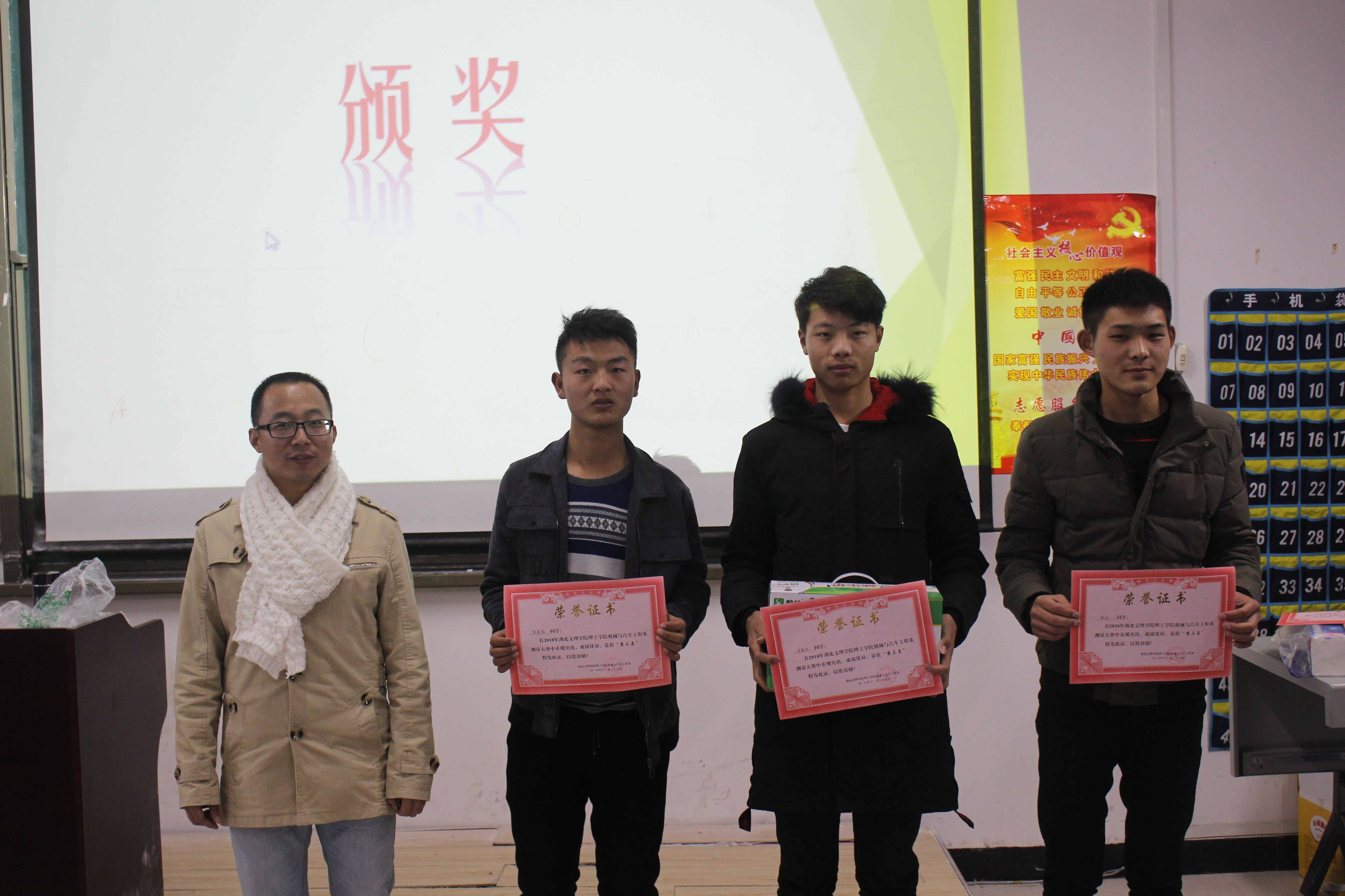 活动伊始,主持人宣布了比赛相关规则及参赛团队。第一轮进行淘汰赛,所有参赛者在规定时间内完成一张对常用仪器的功能或常识的一张答卷。团队总分最高的前六组晋级下一轮。接下来,晋级的队伍进行实操,正确使游标卡尺、千分尺、万能角度尺等机械常用测量仪完成对规定实物的测量。比赛场面异常严肃认真,可见每支参赛队伍都做了充足的准备,终于经过评委们讨论过后,晋级前三名的队伍脱颖而出。最后总决赛参赛队员按照要求测电流、电阻和电压,这就需要选手们正确搭建电路,规范使用仪器,读取数据规范。评委们本着公平公开的原则,在经过激烈的比拼后,梦之队的马旨洋、符宣勇、毛海涛获得冠军。赛后赵老师给前三名及优秀团队颁发了奖品奖状,并合影留念。