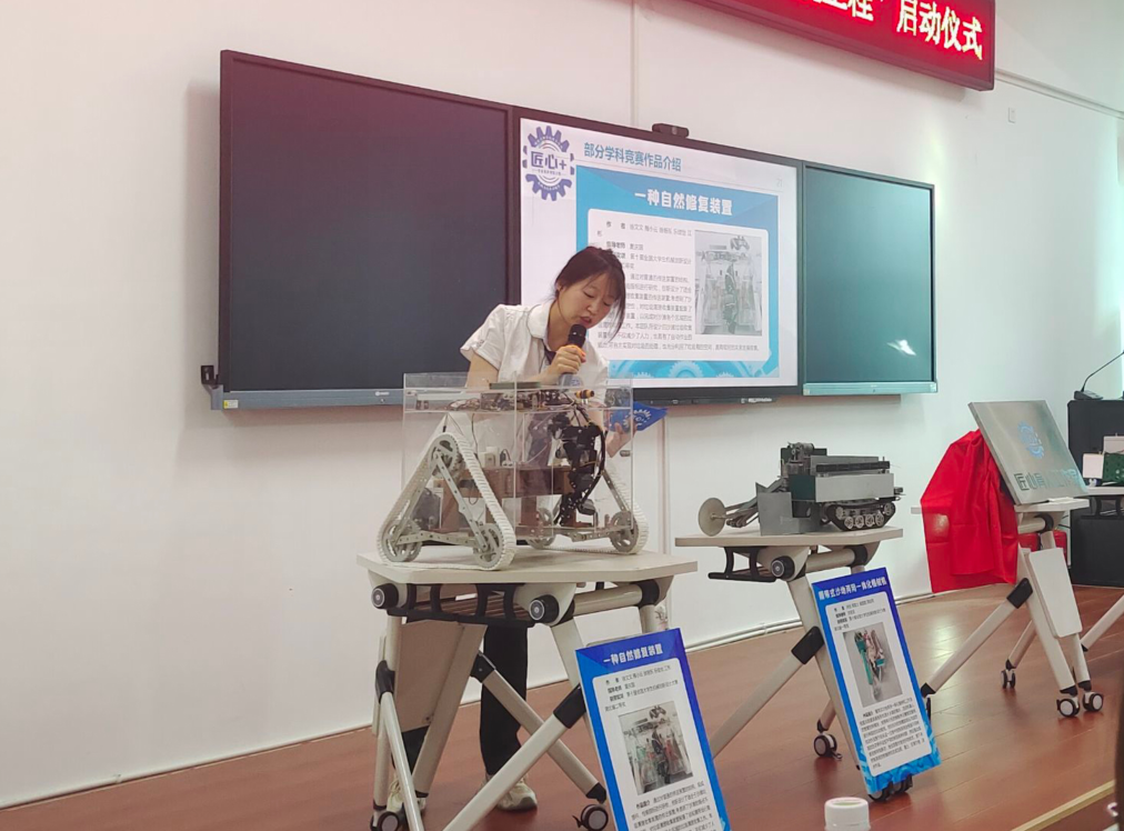 仪式现场,机械系学科竞赛代表徐文文、学生代表乐佳怡先后对机械系往届学科竞赛参赛获奖作品及参赛收获进行讲解与分享,对全系学生发起参赛号召,激励机械系学子们在实践中磨砺自己,把工匠精神贯穿学习生活始终。