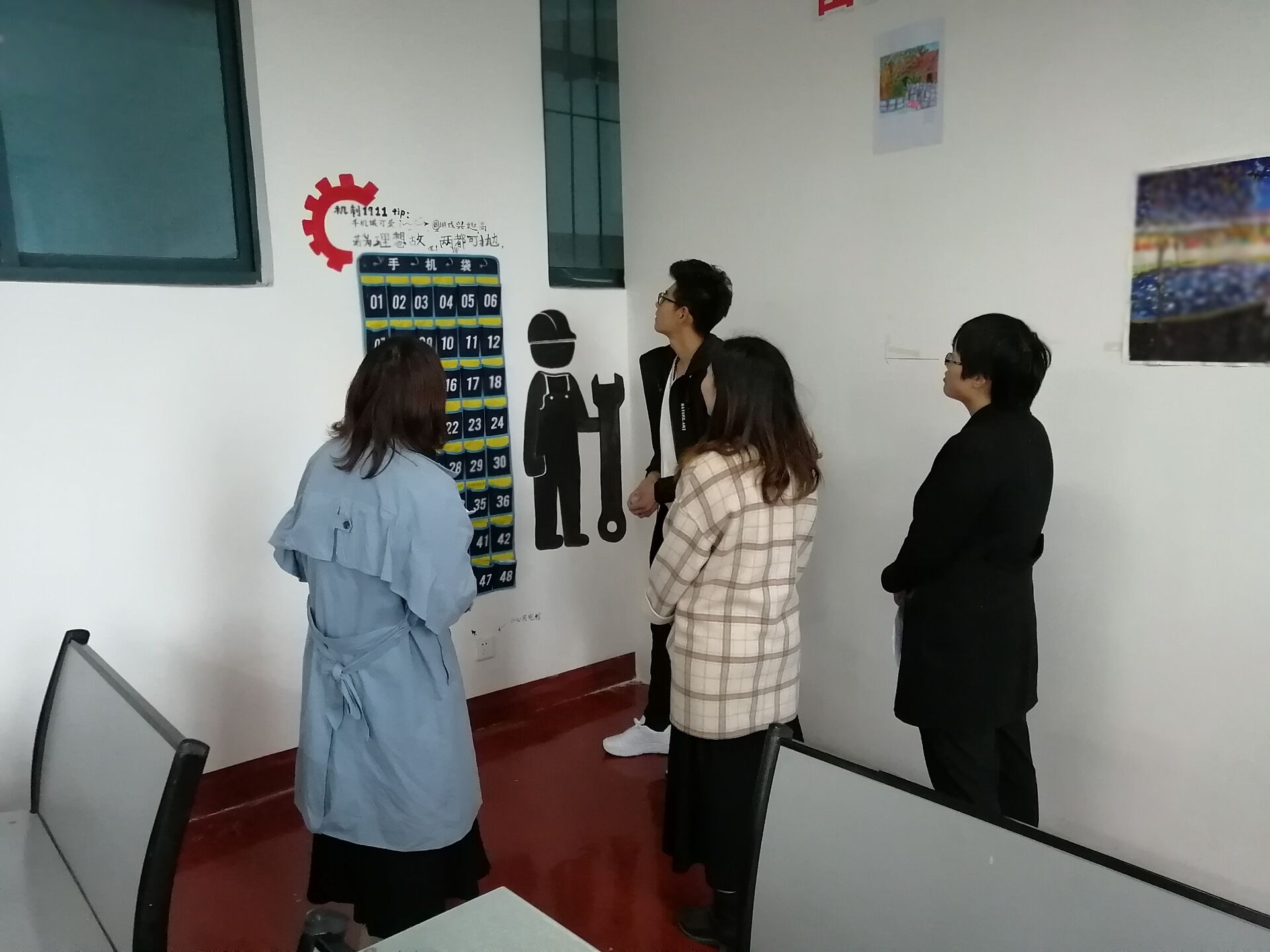 机制1911班讲解员田佳鑫同学首先介绍了前墙上的班级公约以及机械钟,在讲台上放上自制的收纳盒;手机袋旁画着机械系的系徽,并且写了贴心标语;后墙上主要是同学们的艺术画,左右两面墙上主要以图画和贴画为主,整体风格简约不失单调。