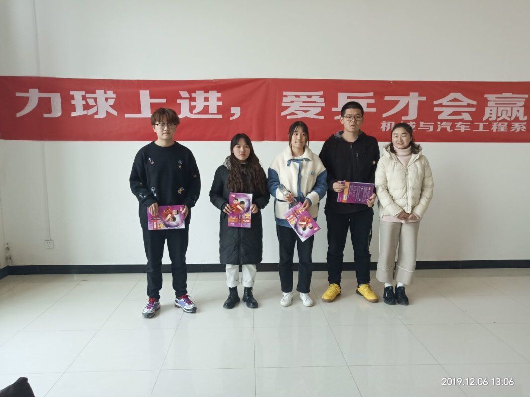 (机械系 吴勉)丰富校园文化生活,加强大学生德智体美劳建设,机械与汽车工程系于12月4日至6日在教职工活动中心成功举办了“力球上进,爱乒才会赢”为主题的乒乓球比赛。我们团委书记桂梦怡老师等领导出席了当天竞赛开幕式。