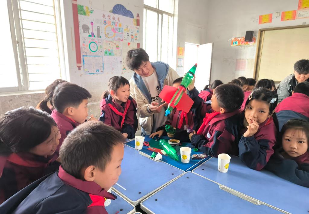 匠心志愿者王东俊以神舟十九号发射视频引出主题,通过视频演示、实物模型展示和有奖问答等方式,给孩子们讲解了航天的发展历程、航天精神的内涵等等。随后,匠心志愿者们带领着小朋友们分组手工制作水火箭模型并成功发射制作的“小火箭”。