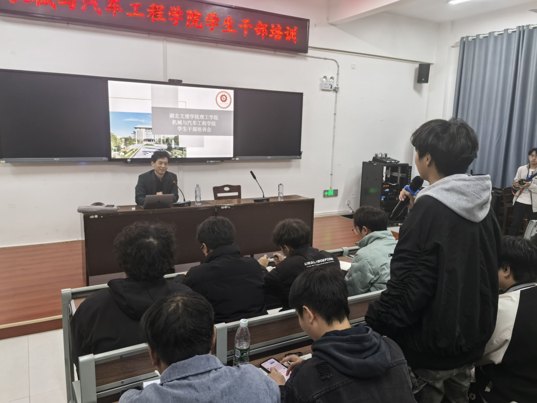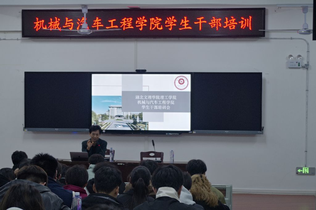 (通讯员陈鑫)为进一步加强学生组织建设,提升新时期学生干部综合素质,11月20日晚,机械学院在1J-105开展学生干部专题培训,此次培训会特邀学校副校长耿帮才担任主讲嘉宾,机械学院辅导员郭祥楠、全体学生干部等100余人参加培训。