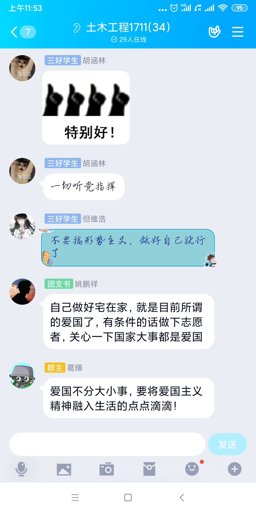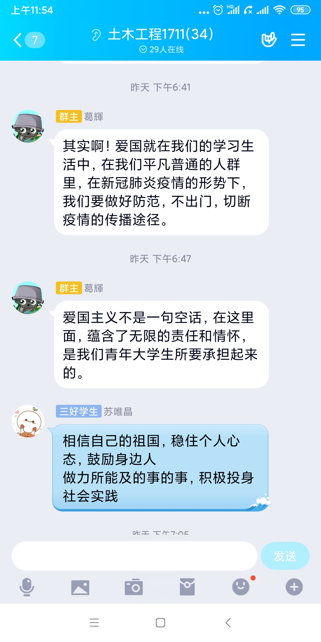 为了落实《关于我们开展第二期线上主题教育的通知》精神,我系结合当前的疫情防控形势,在线上开展主题教育,组织各个班级学习了《新时代爱国主义教育实施纲要》,并就学习心得以及如何做好疫情之下的爱国展开了线上讨论交流。讨论中,同学们纷纷表示“爱国主义不是一句空话,要落实在生活中、实际行动中,承担起责任。”。