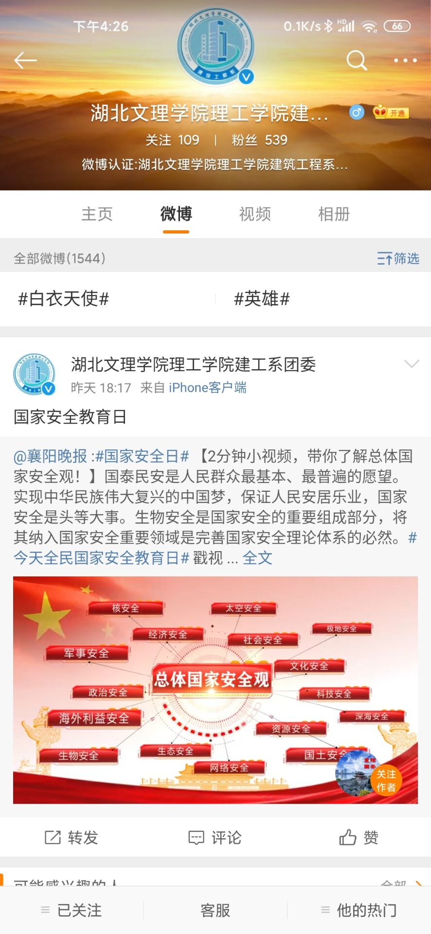 三是通过新媒体加大了对国家安全日的知识普及。系部通过微博、微信公众号等,推送全民国家安全教育日的相关内容,引导学生学习浏览,让学生更加全面的了解国家安全知识,同时也让学生明白维护国家安全人人有责。
