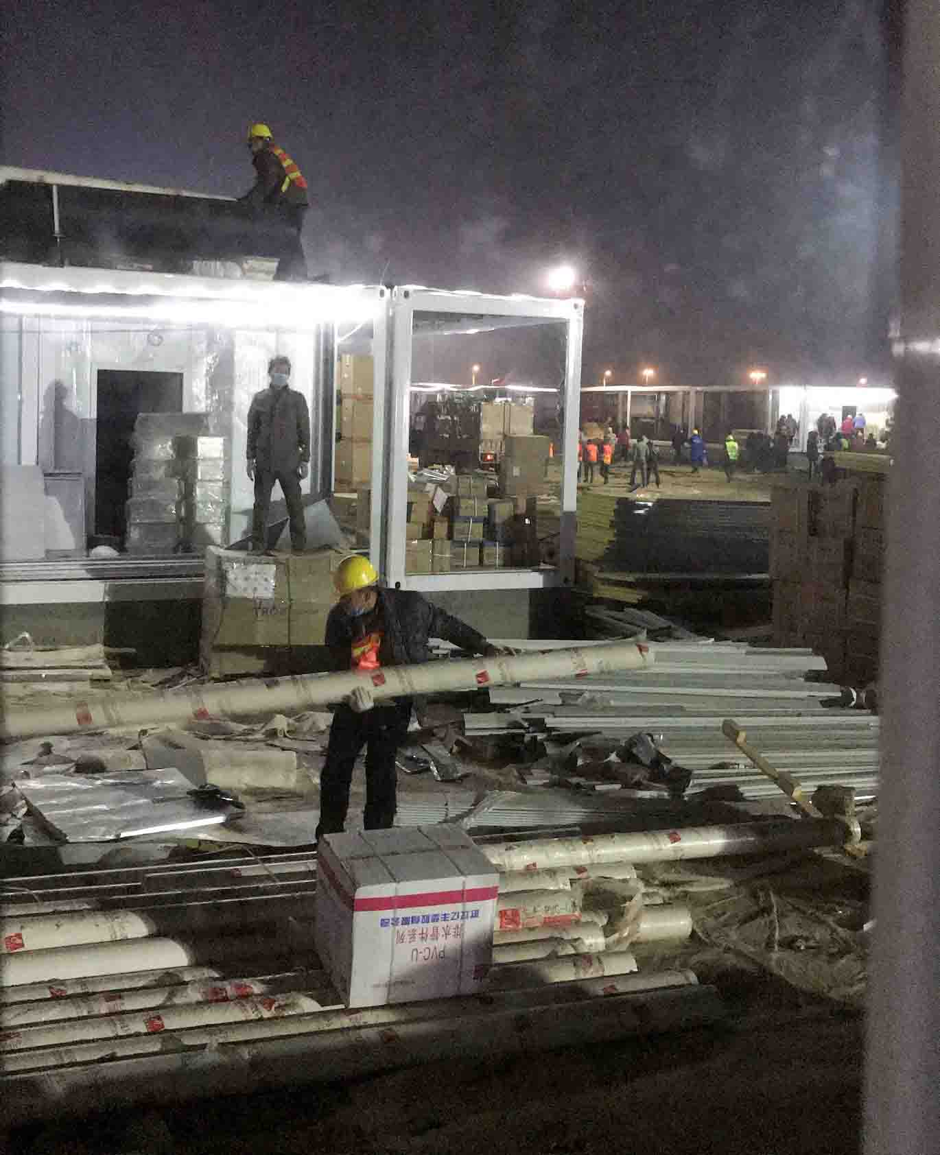 期间柴明同学在这连续工作五天,整个工地是三班倒一天二十四小时不停断施工,里面有来自全国各地的工人和志愿者们,大家都是在夜以继日的建设着雷神山医院,在我工作了五天左右医院基本完工,并交付使用两个病区,其也算是工作完成,考虑不给其他人带来传染的风险,柴明同学回家自行进行隔离观察。