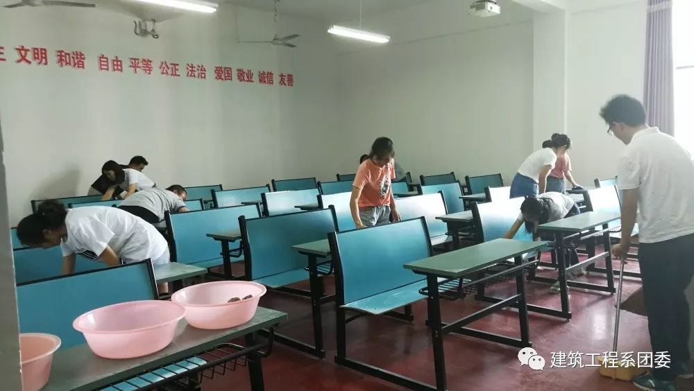 (建工系 张巧巧)为了给学生营造一个优美、舒适的学习环境,以崭新的面貌迎接新学期的到来,8月24日上午,建筑工程系主任刘琦良,书记付明星带领全系教师对系部教室开展了“卫生大扫除,喜迎新学期”活动。