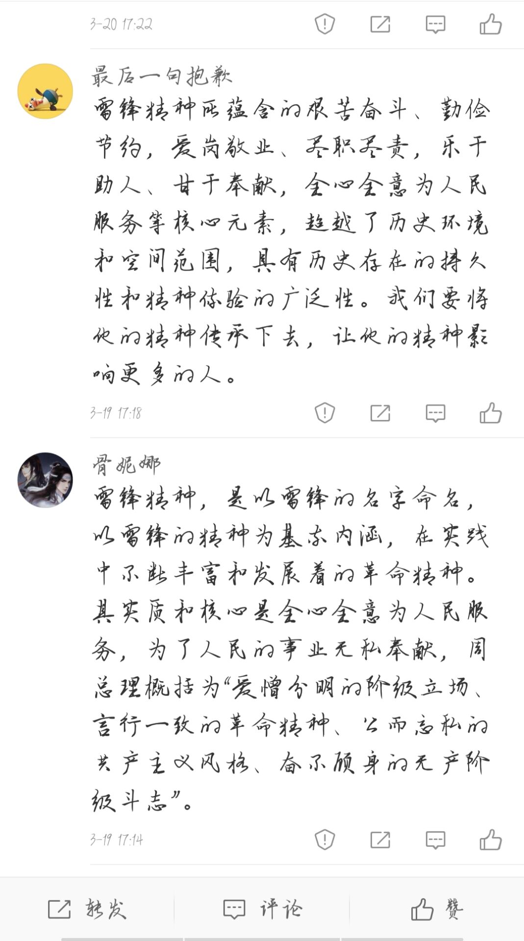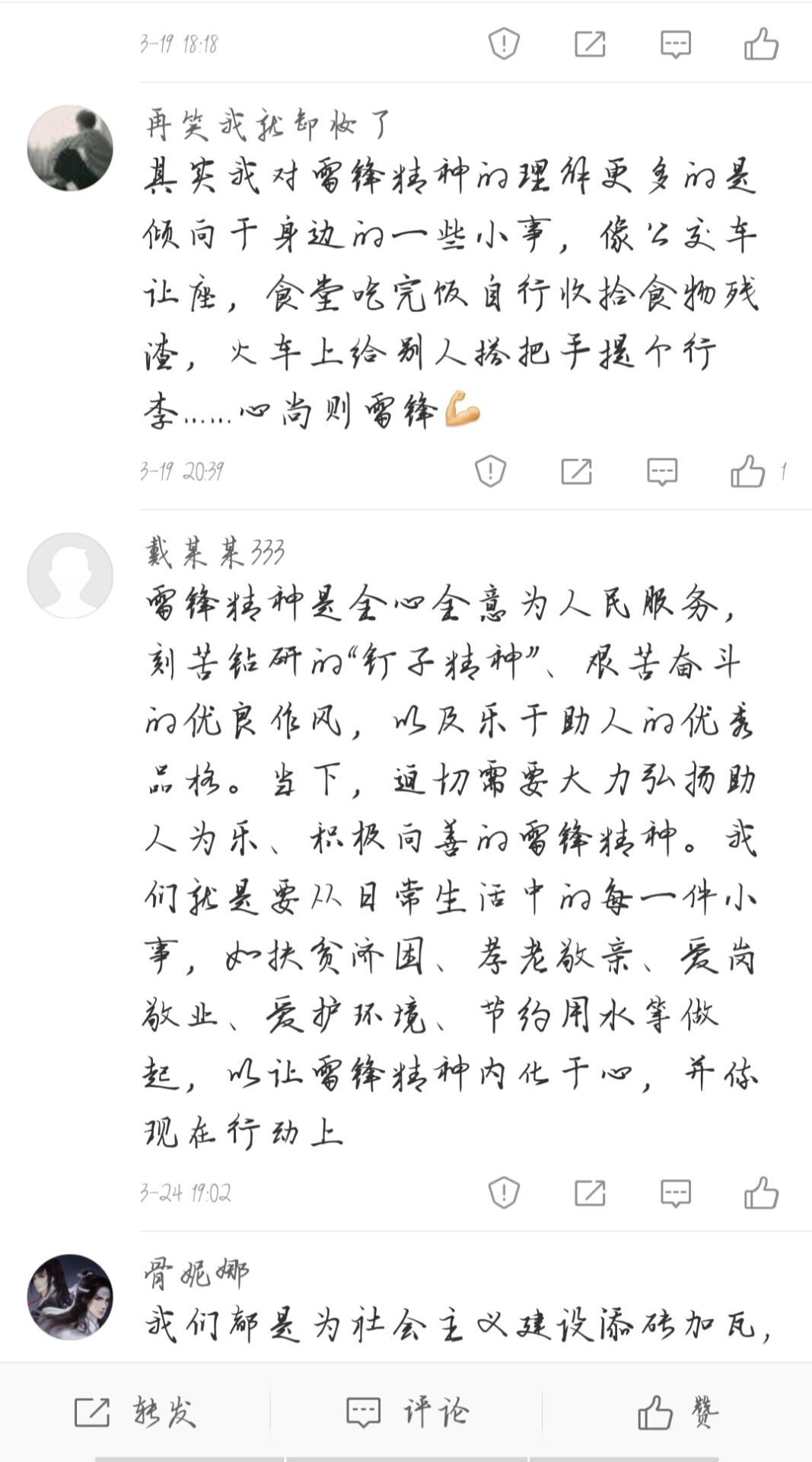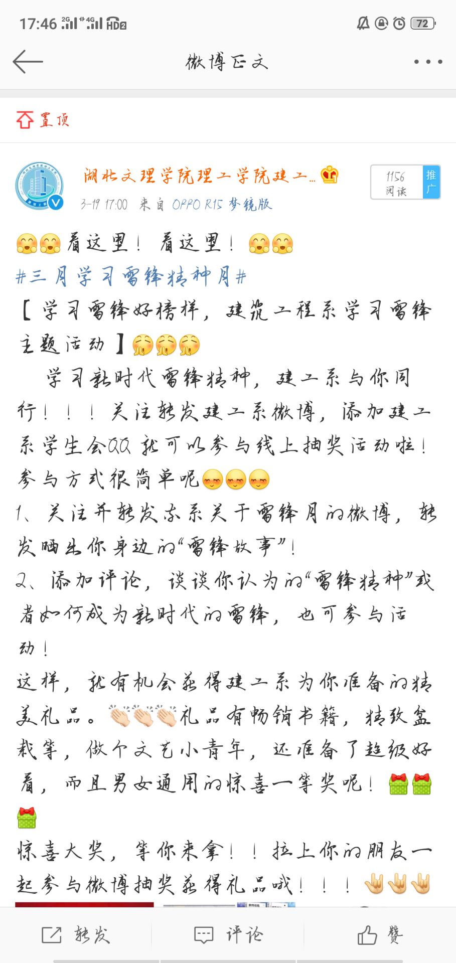 2019年3月,建筑工程系学生会发起了“晒雷锋故事、扬雷锋精神”线上讨论活动,参与者通过关注建工系微博,并在评论区晒发生在自己身上或者是身边的好人好事、谈谈对雷锋精神认识、如何去弘扬雷锋精神等。活动还为参与者设置了抽奖环节,参与活动的同学有机会被系统抽中,并获得建工系为大家准备的精美礼品。活动上线后,引起了广大网友的积极参与,大家纷纷在评论区点赞、回复。此次活动对象不只是我系学生,更是面向了更多的微博用户,取得了良好的反响。