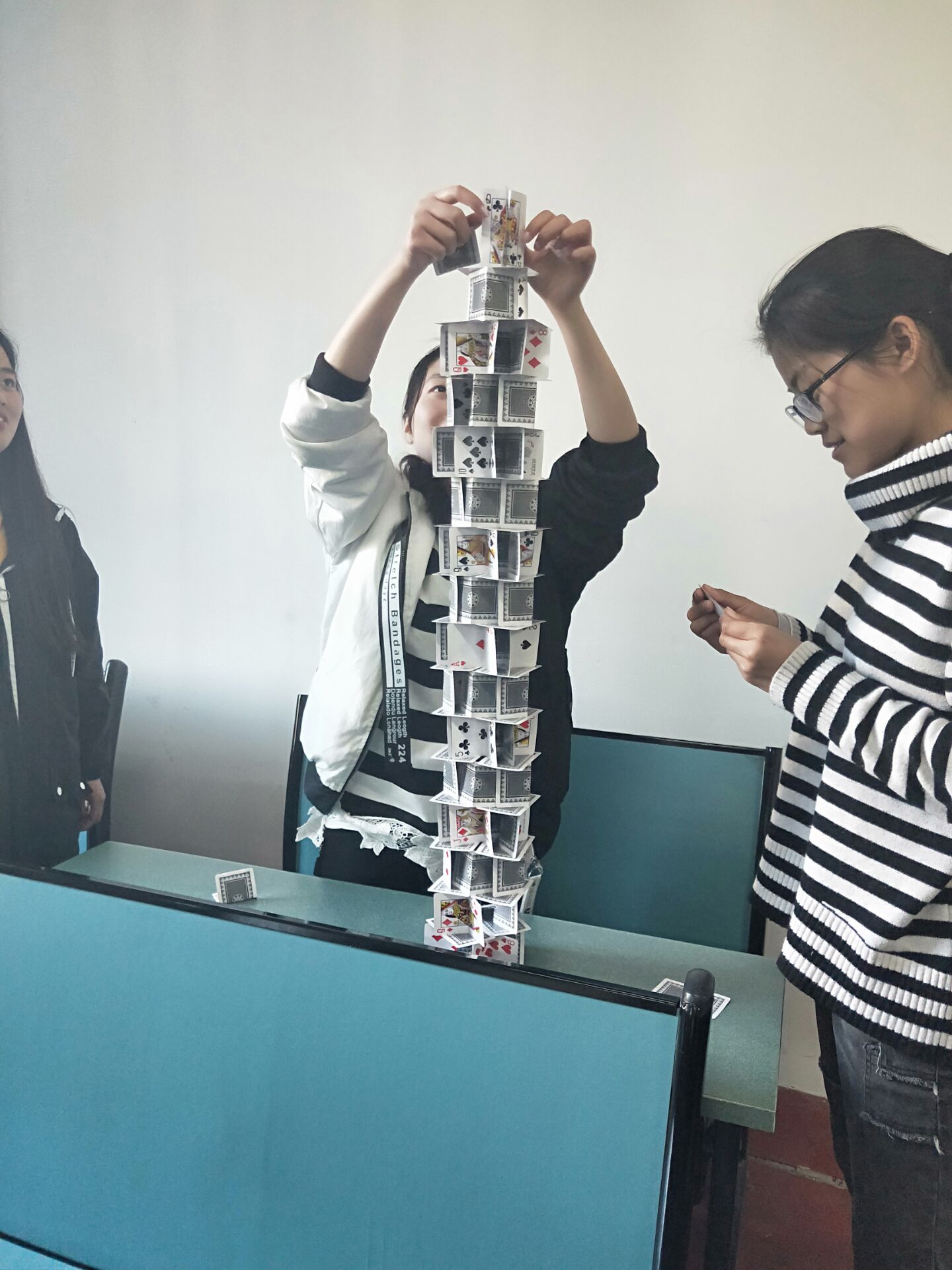 比赛要求只用一副扑克牌且不用任何粘合剂,不用任何辅助工具,也不能剪裁纸牌,怎么样把纸牌搭得更高呢?比赛分三人一个小组,开始后,各小组紧张有序又小心翼翼地搭起纸牌来,小小纸牌牵动着每个人的心,越到高处,挑战越大,看着那纸塔颤颤悠悠、摇摇欲坠的样子,放纸牌愈发小心翼翼,选手们屏住呼吸,生怕自己大口喘气让叠得高高的纸牌哄然倒塌……经过20分钟的激烈竞争,同学们纷纷交出了自己的作品。最后,经过测量,胡梦婷小组搭出的扑克牌纸塔达到82.9厘米,获得本次比赛的冠军。