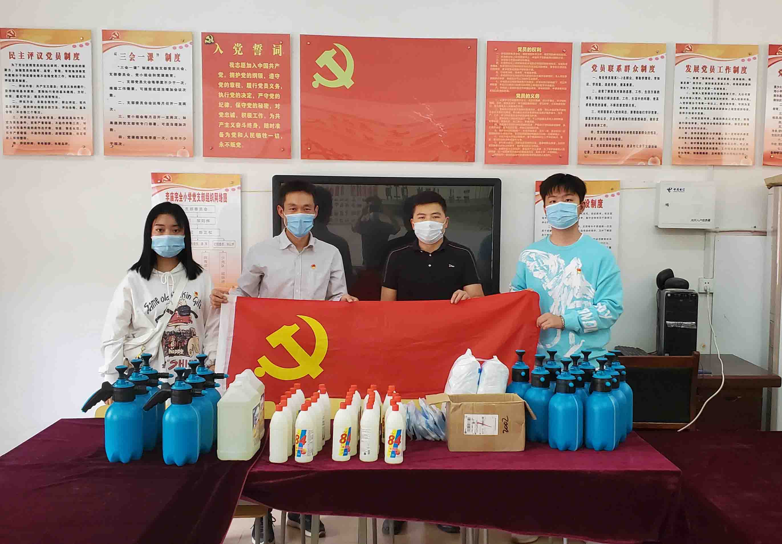 此次活动是由我系的20名学生党员共同组织的,由于疫情防控工作的要求,党员们不能都到现场参与活动,支部书记和三名党员将大家筹集的物资送到小学。此次活动共捐献瓶装84消毒液40瓶,散装84消毒液10升,30ml装免洗洗手液120瓶,一次性医用口罩500个,便携式消毒喷壶15个,共计价值1200余元。
