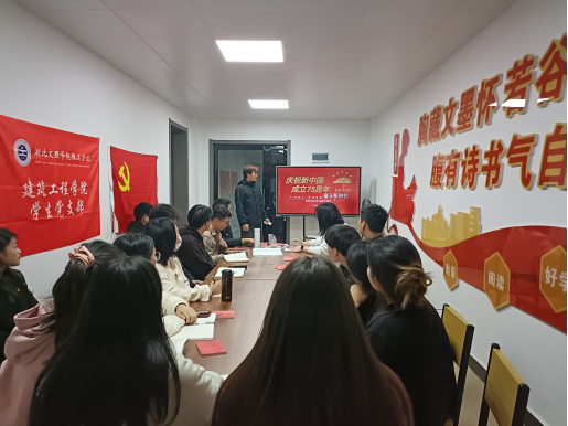 (通讯员 汪纪婷、赵明敏)为了使学生党员深刻了解革命历史,传承红色基因,建筑工程学院学生党支部于10月22日下午在“一站式”学生社区多功能活动室开展以“红心向党庆华诞,砥砺奋进建新功”为主题的10月支部主题党日。此次“学生党员讲党课”活动由学生党员宋展鸿同志主讲,党课主题为《庆祝新中国成立75周年》。活动由学生支部书记汪纪婷主持,全体在校生党员参加。