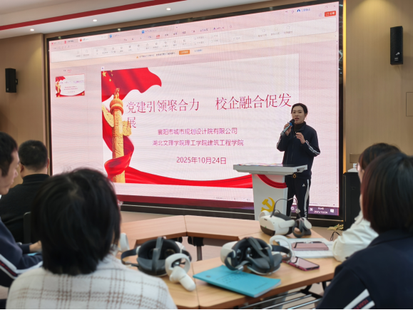(通讯员张婷)2025年10月24日,伟德bv1946官网建筑工程学院教工党支部与襄阳市城市规划设计院党支部,在理工学院智慧党建室成功举办以“党建引领聚合力校企融合促发展”为主题的联合主题党日活动。双方党员代表及业务骨干齐聚一堂,通过理论共学、技术体验、专题研讨等丰富形式,共同探索党建与业务深度融合的新路径,为校企协同发展凝聚新动能。