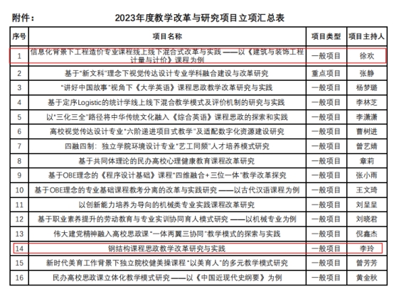 (建工系 徐雅妮)近日,根据《关于开展2023年度教学改革与研究项目申报工作的通知》(院政发教〔2023〕12号),经专家评审并公示,我系徐欢老师的“信息化背景下工程造价专业课程线上线下混合式改革与实践——以《建筑与装饰工程计量与计价》课程为例”和李玲老师的《钢结构课程思政教学改革研究与实践》成功立项。