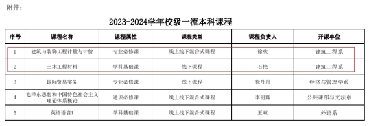 近日,根据学校公示结果,我系徐欢老师主讲的《建筑与装饰工程计量与计价》和石艳老师主讲的《土木工程材料》两门课程被评为校级一流课程。今后,我系将继续申报更多课程,组织教师开展教学改革,力争提高教学质量和学生培养质量,严抓教学关,持续打造优质课堂。