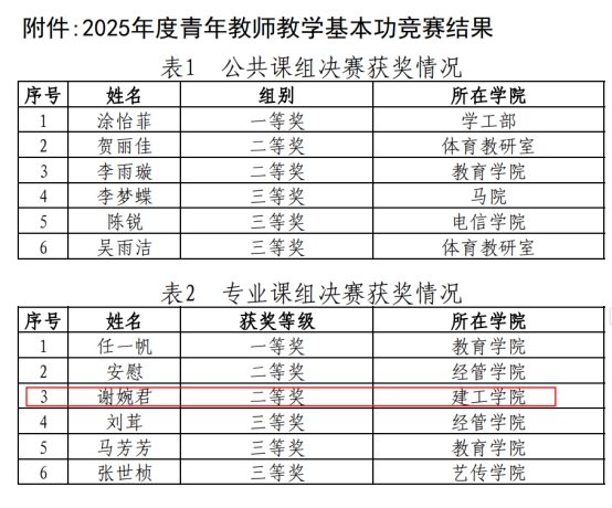 (建工学院 徐雅妮)在近日举办的2025年度青年教师教学基本功竞赛中,我院青年教师谢婉君凭借扎实的教学功底、创新的教学设计以及出色的课堂表现,荣获二等奖,展现了我院青年教师的卓越风采。