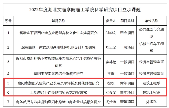 2022年5月2日,学校启动2022年度校级科研项目申报工作,我系积极组织教师申报。经各单位审核推荐,专家评审,9月5日公布评审结果,我系徐欢老师的《襄阳市装配式建筑产业发展水平评价及优化路径研究》、程俊斐老师的《工期差异下连续刚构桥合龙方案研究》成功立项。