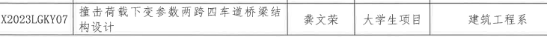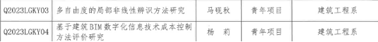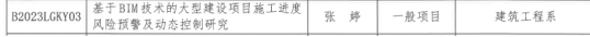 其中,建筑工程系张婷教师的《基于BIM技术的大型建设项目施工进月风险预警及动态控制研究》、马砚秋教师的《多自由度的局部非线性辨识方法研究》、杨莉教师的《基于建筑BIM数字化信息技术成本控制方法评价研究》、龚文荣同学的《撞击荷载下变参数两跨四车道桥梁结构设计》成功立项。