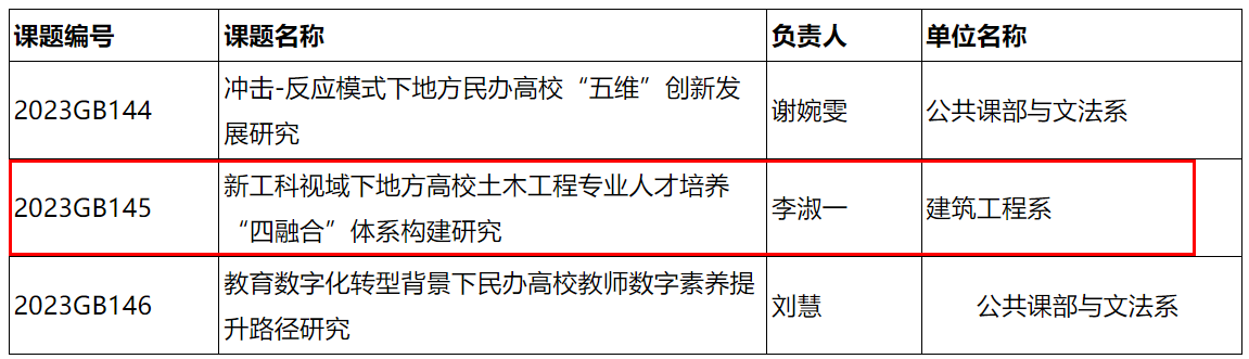 (建工系 李玲)根据鄂教科研〔2023〕1号文件,湖北省教育科学规划2023年度课题经专家评审、公示,湖北省教育科学规划领导小组审定,已公布结果。我们2023年度共获批3项教育科学规划项目,我系李淑一老师喜获一般课题立项。
