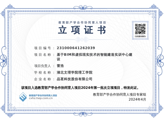(建工学院 邓才莹)今年4月我院雷浩老师与品茗科技股份有限公司合作开展产学合作项目,该项目主要研究“基于BIM和虚拟现实技术的智能建造实训中心建设”,项目入选2024年第一批次教育部产学合作协同育人立项项目。