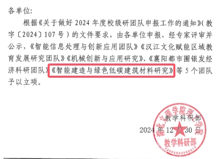 (建工学院 邓才莹)经过前期自主申报、专家评审及公示,2024年12月30日,我院成功立项校级科研团队建设项目。