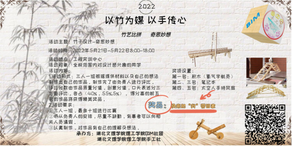 为提高校园文化氛围,丰富广大学生在校生活,建筑工程系BIM协会和手工社特此联合举办“以竹为媒,以手传心”的竹艺比拼活动。