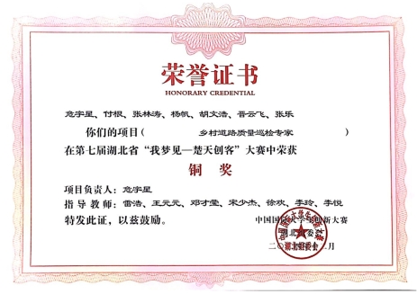 (建工学院 雷浩)在7月份举行的中国国际大学生创新大赛中,我院学子在雷浩等老师的带领下,获得省铜奖,实现了我院在该大赛中奖项的零突破。项目负责人危宇星同学带领团队,凭借其创新项目“乡村道路质量巡检专家”在众多参赛作品中脱颖而出,展现了我院学子的创新精神和实践能力。