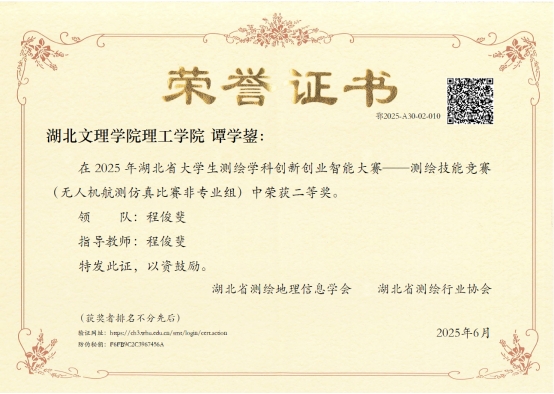 (建工学院 程俊斐)5月30日,2025年湖北省大学生测绘学科创新创业智能大赛——测绘技能竞赛落下帷幕。作为工程测绘领域较有影响力的赛事之一,经过多名高校的激烈角逐,我们建工学子孙荣乐在“数字测图仿真比赛非专业组”中荣获特等奖,谭学鋆在“无人机航测仿真比赛非专业组”中荣获二等奖。