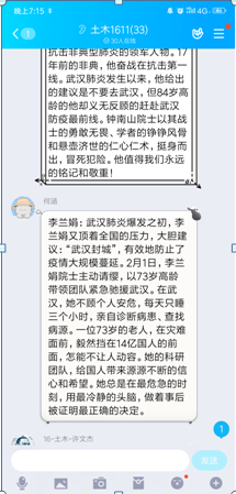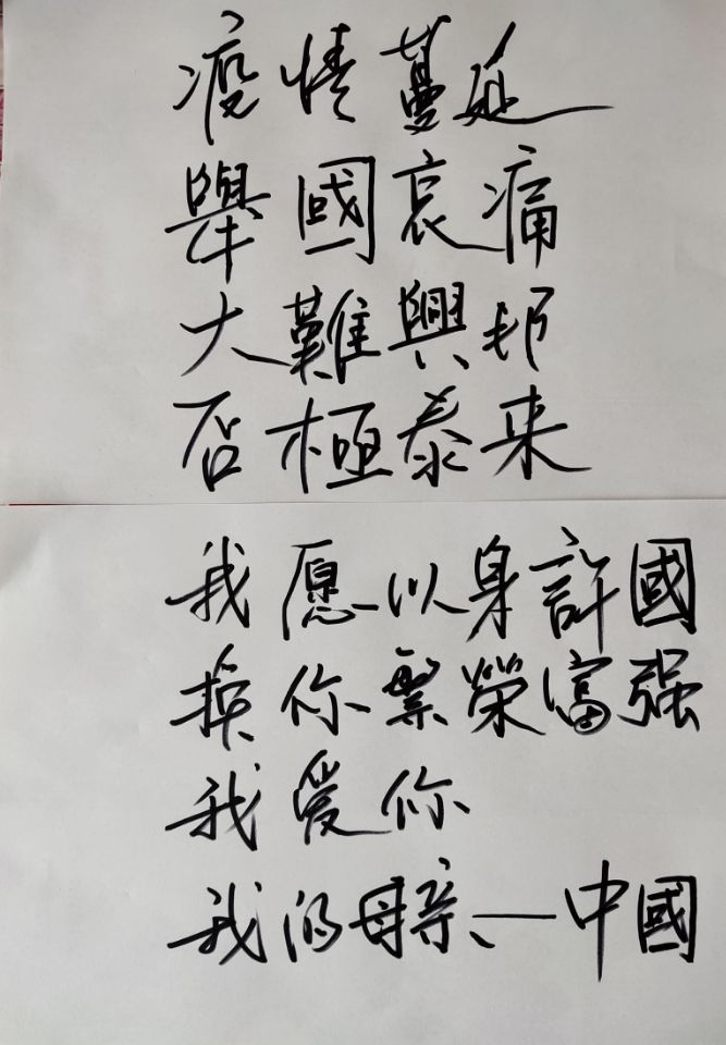 此外,同学们还纷纷分享了抗击疫情——最令我感动的瞬间”人物、故事,学习他们的奉献和担当精神。并通过书法、绘画、拍摄小视频等多种形式表达了自己对祖国想说的话以及情感和誓言。
