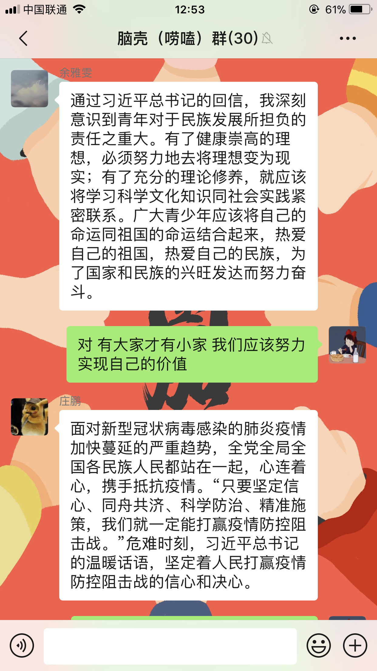 “我们学生是祖国的未来和希望,要时刻牢记我们的人生价值和理想追求与中国的前途命运是紧密联系在一起的,要有高度的责任感和主人翁意识。在工作生活中遇到问题、发现错误的时候,既不能有“位微言轻”的自卑感觉,更不能有“事不关己”的漠然态度,要拿出青年人应有的正义感,发挥青年人思维活跃的优势,敢于指出问题、善于想出办法。只要是对社会发展有益的事情,就要勇于尝试、敢于担当,在本次疫情中,我们很多学生都很负责任的自我隔离与当志愿者,其中医学院的很多学生的表现够我们当作楷模与典范,这就是我们这代人的担当。”---------团员王磊说。