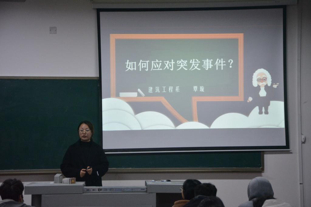 为进一步提升学生干部在面对突发事件时处理问题的能力,建筑工程系于11月28日晚在四教215教室举行干部培训会第四场《如何应对突发事件做好危机公关》,培训会由覃老师主讲。