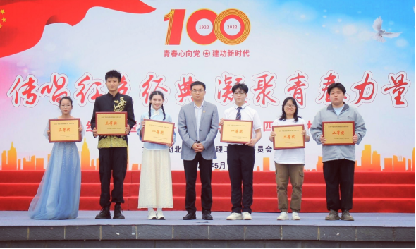 比赛间隙,校领导为获得2021-2022学年度“优秀共青团员”、青年大学习“学习标兵”、“优秀团学干部”、“优秀学生会”、“优秀团务工作者”、“五四红旗团支部”“五四红旗分团委”的先进单位和个人颁奖并合影留念。