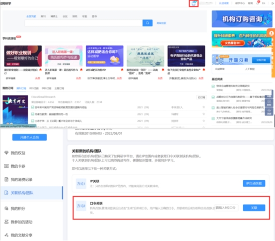 访问方法:通过本人手机号注册登录后,点击右上角的个人头像,进入个人中心-关联机构/团队,点击:IP自动关联或者口令关联,输入六位口令“G8XPHK”。关联机构需在本校校园网IP范围内进行,关联成功后即可使用,不受时间、地理位置限制。推荐使用谷歌、火狐等浏览器。