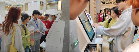 图书馆老师为新生介绍了馆内概况、馆藏资源、电子设备使用、读者服务及规章制度五个部分;引导新生使用检索机,查找定位自己需要的图书;指导新生使用“自助借还机”,现场演示借阅流程,讲解借阅规则;带领新生参观每层布局及图书分布情况。通过讲解、现场体验等方式,帮助新生快速了解馆藏资源、图书借还、数据库查询等内容,为学生在校学习、考级考证、论文撰写提供服务支持。