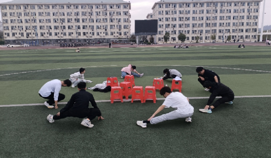 下图为肖雄老师带领的定向越野校队正在进行训练后的拉伸运动。