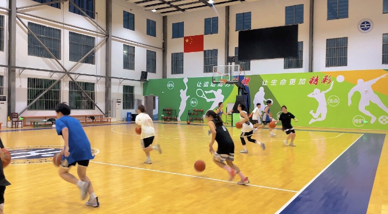 下图为吴雨洁老师带领的篮球女队在篮球馆进行基本功训练。