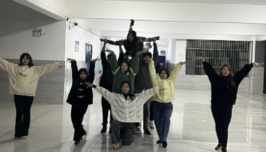 下图为贺丽佳老师带领的体育舞蹈校队正在进行赛前专业技术巩固训练。