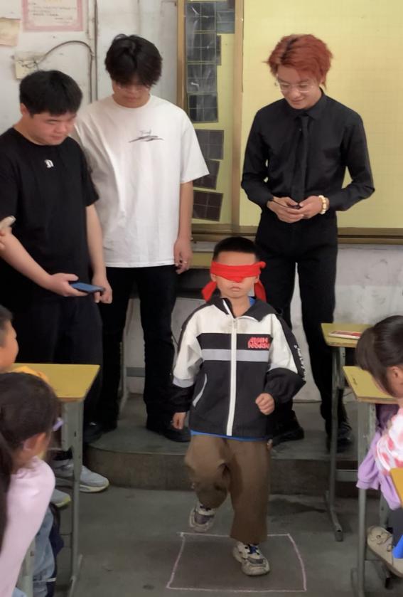 本次活动由马克思主义学院教师王啸鹏、惠文君带领建工学院的大学生给一年级的小学生开展了一堂有趣的、有温度的、有深度的思政课。本次活动紧扣“挑战”主题,从生活、运动和学习三个方面探寻自我挑战的元素,特别是在“生活中的挑战”这一环节,一年级的小朋友在大学生老师们带领下参加了蒙眼踏步的活动,引导他们在挑战自我的同时,体验视障人士生活之不便,从而唤醒小朋友心中关爱视障人士的一团火焰。