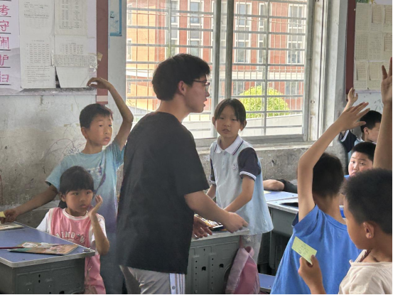 讲授过程中,大学生教师引导小学生们结合学习实际情况,正确对待自己的不足,并努力改进。以竖起大拇指“我能行”小游戏形式,调动了小学生们参与的积极性,并邀请三名小学生分角色进行扮演,生动且形象演绎了青蛙看海的故事,启发了小学生们面对困难时,要坚定目标、脚踏实地。此外,小学生们以分享励志名言警句来激励自己不能向困难低头,敢于翻山越岭,励志前行。