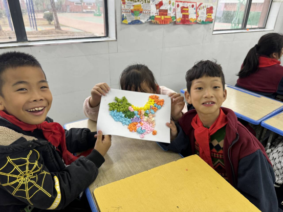 课堂伊始,老师带领大家进行“手工贴地图”活动。同学们变身巧手小工匠,精心勾勒祖国轮廓,充分展现对祖国山河的热爱。