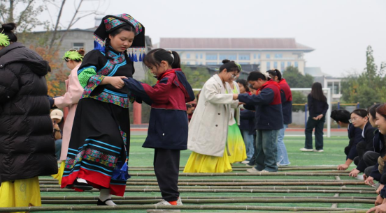 活动伊始,唐银梅老师用石榴引出习近平总书记关于民族团结的比喻:“民族团结非常重要,我们五十六个民族要像石榴籽一样紧紧抱在一起。”随后,英语及学前教育专业的大学生们通过民族知识问答、傣族舞蹈表演等环节,让小学生们在轻松愉快的氛围中感受多民族文化的魅力。壮族竹竿舞环节更是点燃全场热情,大学生与小学生共同起舞,传递民族团结的欢乐与和谐。