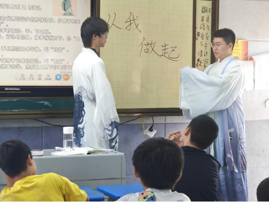 活动的高潮当属传统文化体验环节。两位同学身着传统服饰,化身古代文人雅士,用“请赐教”“叨扰了”“承让”等文雅用语进行日常对话。一旁的旁白将古雅词句转化为现代语境,让孩子们仿佛穿越时空,亲眼见证古人温文尔雅、彬彬有礼的交流场景。“原来古人说话这么有韵味!”“以后我也要像古人一样有礼貌!”孩子们惊叹连连,纷纷模仿古人的礼仪和用语,在欢声笑语中感受中华语言的魅力。