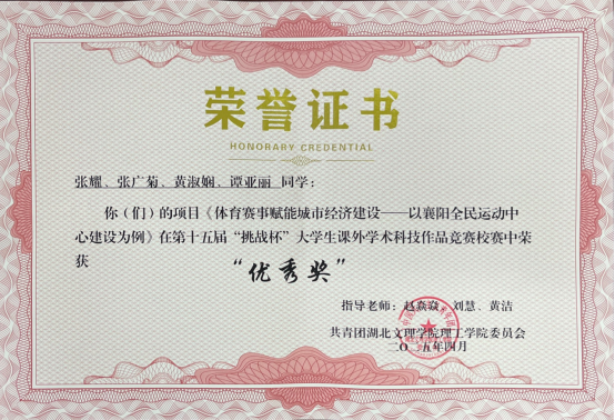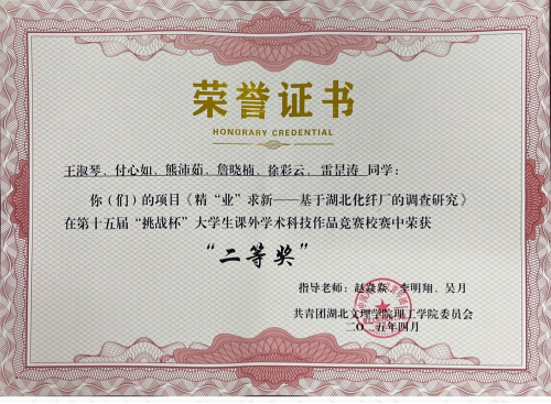此次竞赛由马克思主义学院赵焱焱、刘慧、李明翔、吴月老师联合指导的《精“业”求新—基于湖北化纤厂的调查研究》《体育赛事赋能城市经济建设—以襄阳全民运动中心为例》两个参赛项目,在众多优秀作品中脱颖而出,荣获“二等奖”和“优秀奖”。