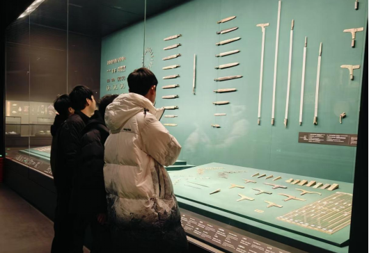 “同学们请看这件战国形凤鸟纹漆瑟,其纹饰中蕴含的审美追求,正是中华优秀传统文化的重要组成部分,这与《习近平新时代中国特色社会主义思想概论》课中讲到的‘中华优秀传统文化是中华民族的精神命脉’高度契合。” 刘慧老师结合展品,现场解读习近平总书记 “以文化人、以文润城” 的重要要求,引导同学们在参观中建立“器物—故事—理论—使命”的认知递进。同学们沿着展线缓步前行,仿佛步入跨越千年的历史长廊。他们驻足于代表性的青铜、玉器与瓷器之间,潜心品味其背后的技艺与审美,时而驻足细观,时而低声交流感悟,深入探寻襄阳在荆楚、三国、唐宋等不同时期的文明印记。在自主探寻与沉浸式感悟中,真切触摸这片土地厚重的历史积淀,对中华优秀传统文化的传承与发展有了更为立体而鲜活的认识。