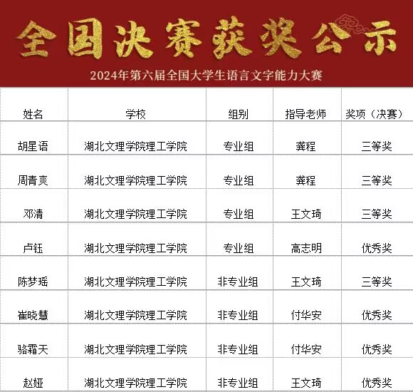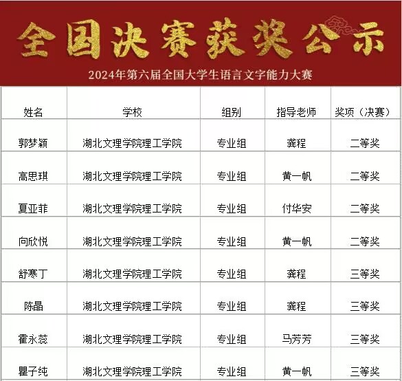 (教育学院 李彬彬 龚程)7月20日,2024年第六届全国大学生语言文字能力大赛全国决赛获奖名单公布,我们共有16位学子在本届大赛中获奖,其中,汉语言文学专业郭梦颖、高思琪、夏亚菲、向欣悦等四位同学获得专业组全国二等奖;舒寒丁、陈晶、霍永蕊、胡星语等七位同学获得专业组全国三等奖;卢钰获得专业组全国优秀奖;崔晓慧、骆霜天等四位同学获得非专业组全国三等奖及优秀奖。同时,教育学院副院长王文琦获优秀组织者奖、龚程老师获优秀指导教师奖。