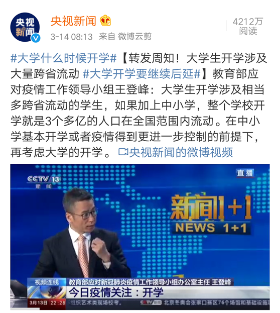 教育部应对疫情工作领导小组王登峰:大学生开学涉及相当多跨省流动的学生,如果加上中小学,整个学校开学就是3个多亿的人口在全国范围内流动。在中小学基本开学或者疫情得到更进一步控制的前提下,再考虑大学的开学的。