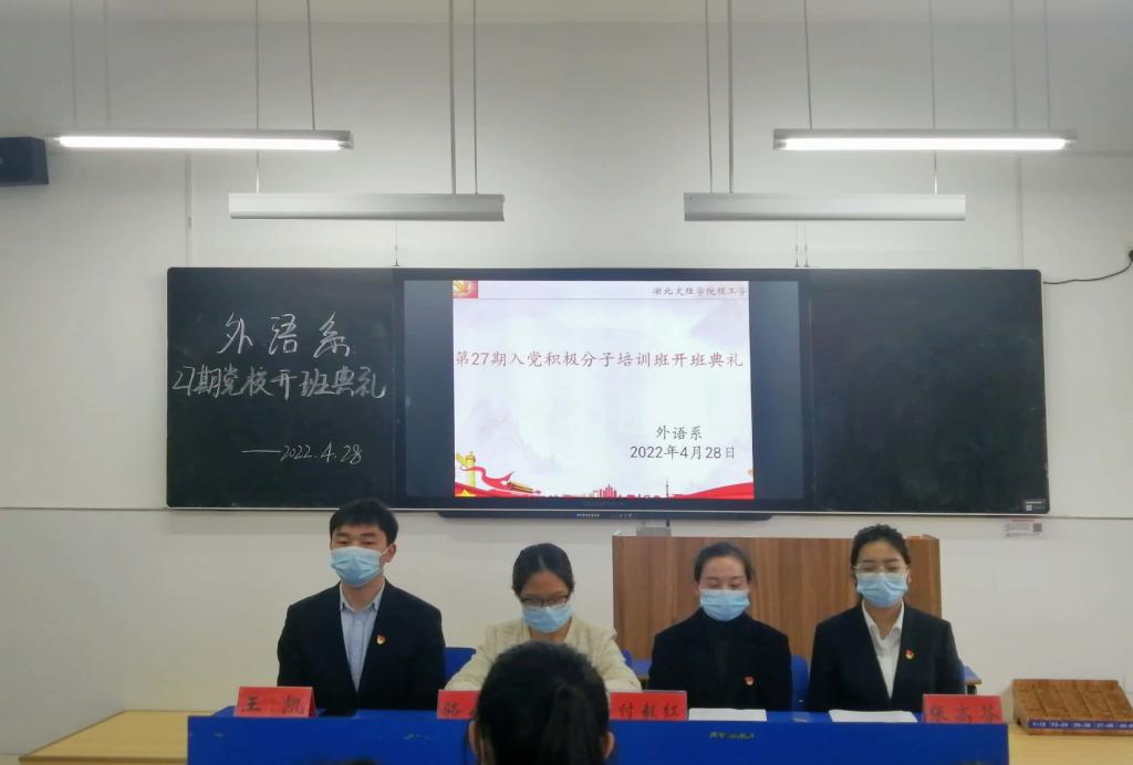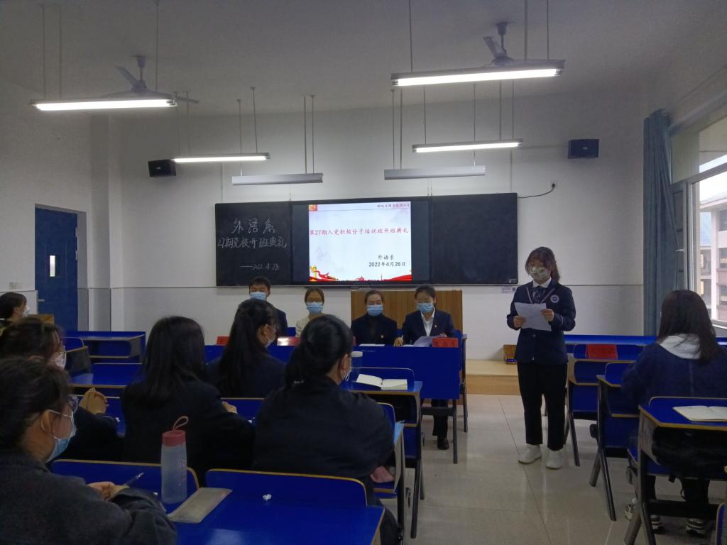 (外语系 王晓燕)4月28日下午,外语系党校第27期入党积极分子培训班开班典礼在8教410举行。外语系党总支副书记骆小青、外语系分团委书记王凯、外语系辅导员付毅红及全体学员参加。开班典礼由外语系学生支部书记 党校班主任张高芬主持。
