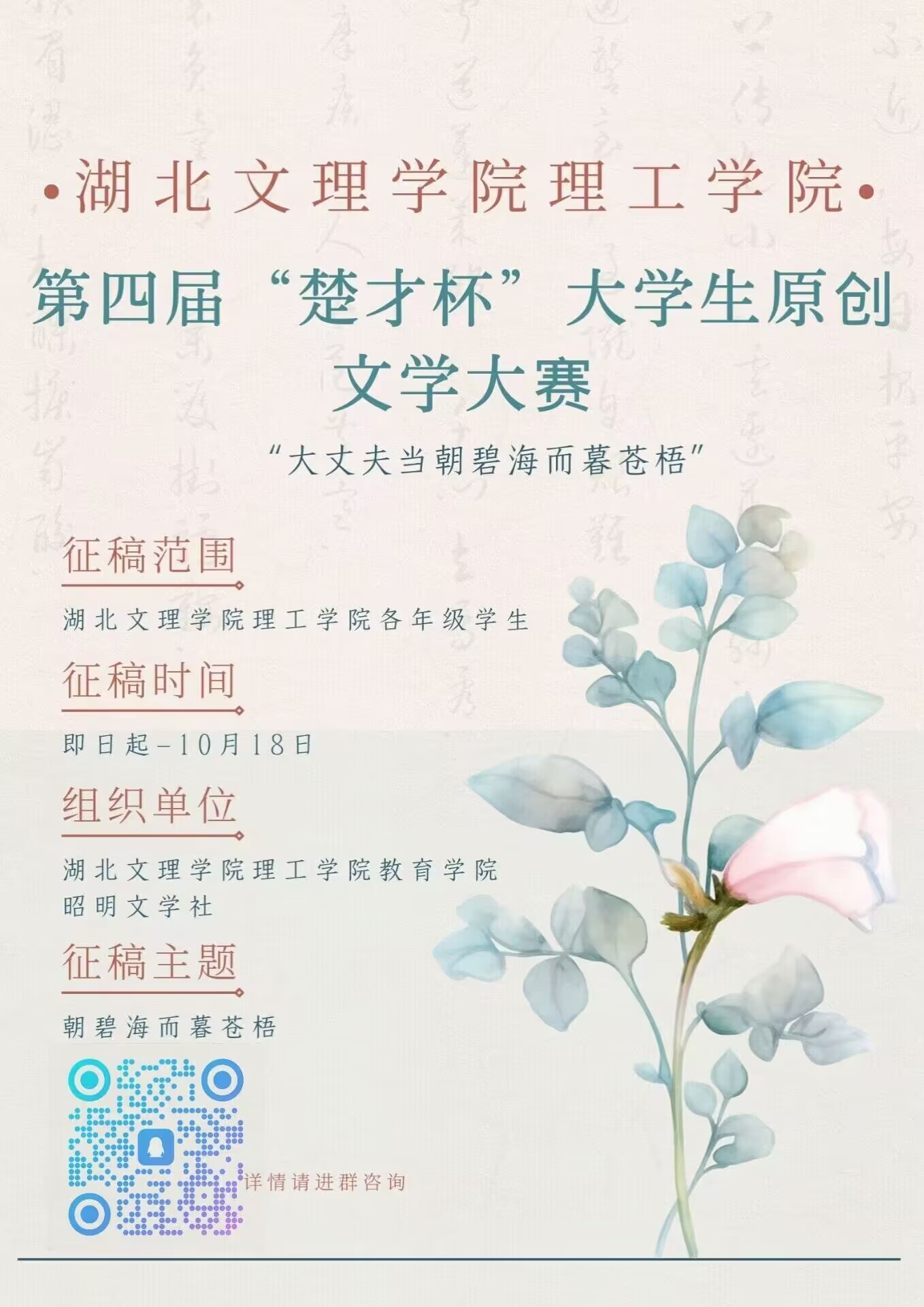 (教育学院 陈媛 龚程)为繁荣校园文学创作,促进青春文学事业发展,发掘、扶持、培养我们文学新秀,由教育学院和昭明文学社联合举办的第四届“楚才杯”大学生原创文学大赛于9月27日正式启动,现面向全体在校学生征稿。