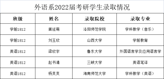 2022年研究生招生考试录取工作已经落下帷幕,外语系共有5名同学成功上岸,分别被山西大学、海南师范大学、三峡大学、鲁东大学、洛阳师范学院等院校录取。今年参加考研的学生共有30人,成功考上研究生的学生有5人,考研成功率为16.7%。与2021年相比,我系参加考研的人数和录取率均有所提升。