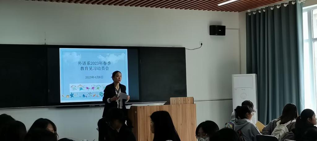 (外语系滕会启)为进一步规范学生实习工作,4月6日下午,外语系在J8-213举行2023春季教育见习动员大会。外语系教学副主任王婷婷、实习指导老师代表赵佳贝、实验员滕会启及2021级学前教育专业全体学生参加了此次大会,滕会启主持会议。