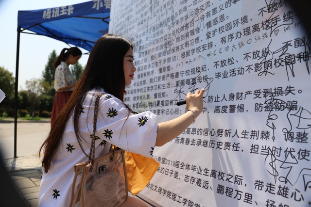 (人文艺术系 燕昊堂)6月13日,由校团委主办,人文艺术系承办的“文明离校,让毕业更有意义”签名活动在校园内举行。